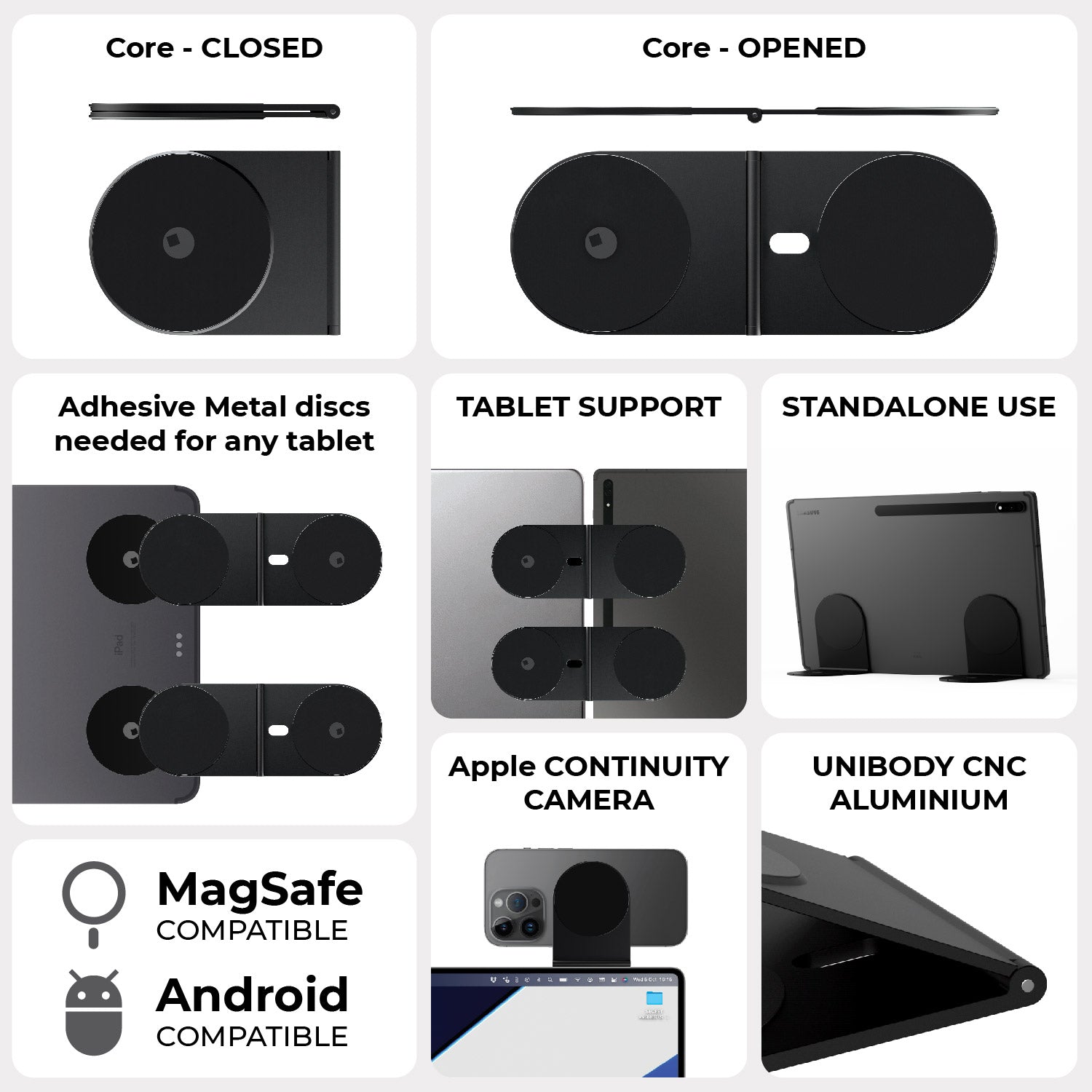 Pro Tablet Kit comes as a set of two Pro Cores, which can magnetically hold your tablet attached to your laptop. The Core is not just a mount but it is the basic component of the ecosystem, you can now easily detach it from your laptop and keep using it in standalone mode, magnetically holding your iPhone, Android phone or tablet!